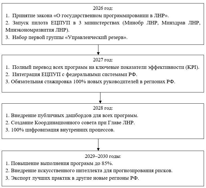 Реализация Дорожной карты предполагается в 2026-2030 годах в четыре этапа: 1-й этап будет проводиться в 2026 году и содержать основные мероприятия, среди которых: разработка законодательных инициатив и запуск пилотного проекта в трех министерствах ЛНР в рамках объединения их работы в сфере реализации отраслевой политики на базе Единой цифровой платформы управления программами; 2-й этап — 2027 год, на этом этапе запланировано проведение таких мероприятий, как перевод всех региональных программ на ключевые показатели эффективности (KPI) и их интеграция на базе Единой цифровой платформы управления программами с федеральными программами, обучение персонала министерств работе с новым программным продуктом; на 3-м этапе к 2028 году предлагается внедрение публичных цифровых интерфейсов (дашбордов) для всех реализуемых министерствами программ и цифровизация внутренних процессов, а также создание Координационного совета при Главе ЛНР; на заключительном этапе (2029-2030 годы) — внедрение искусственного интеллекта для прогнозирования рисков и лучших практик в другие новые регионы РФ.